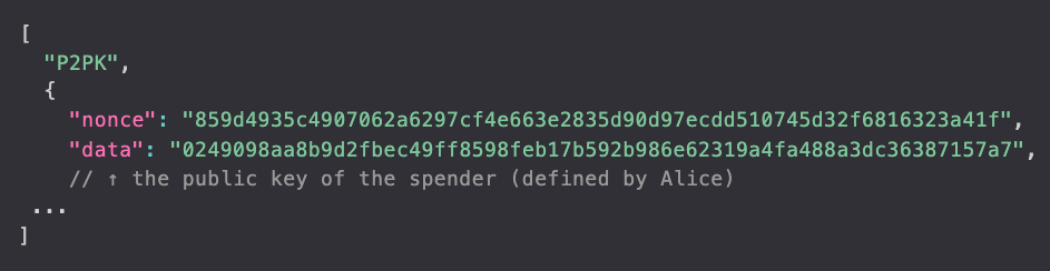 Alice may not want to send tokens that can be spent by anyone, but only to some owner of a public key. This introduces the concept of Spending Conditions.