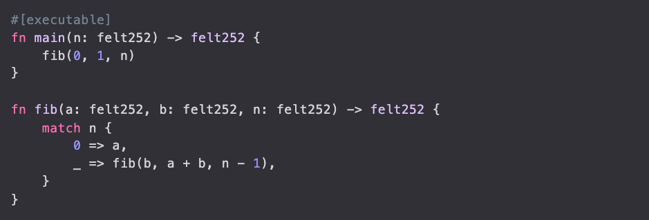 Let's take for example the following Cairo program fibonacci: Fp → Fp computing the n-th Fibonacci number modulo p: